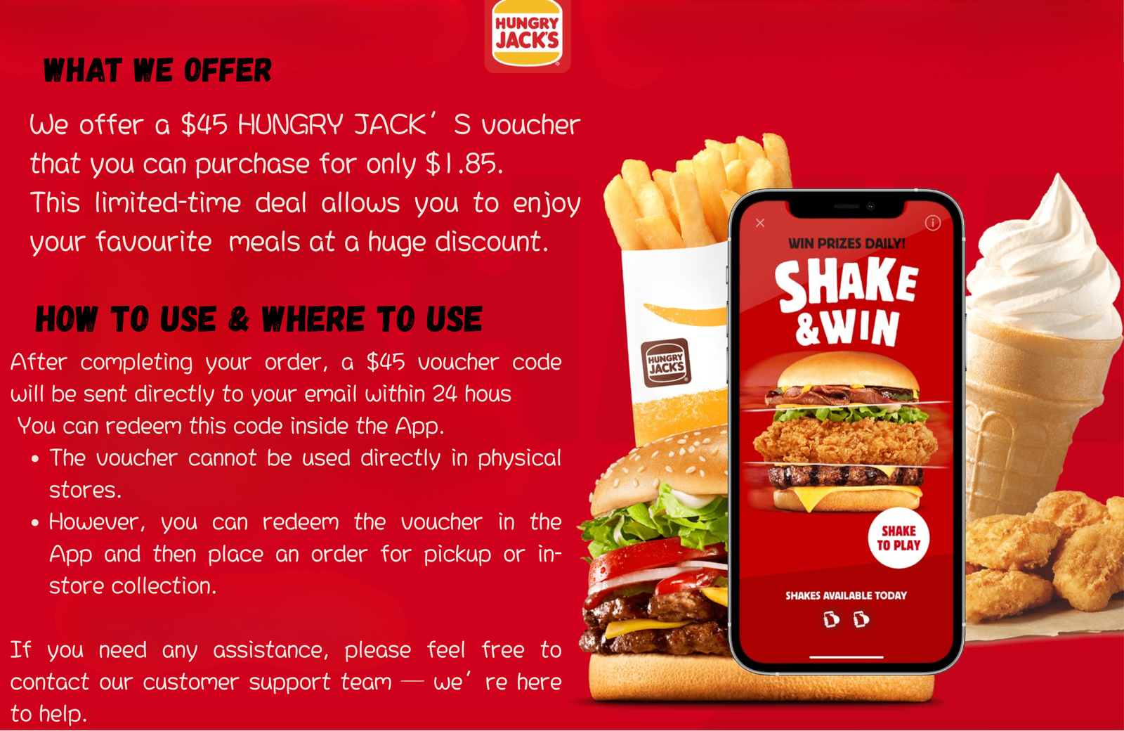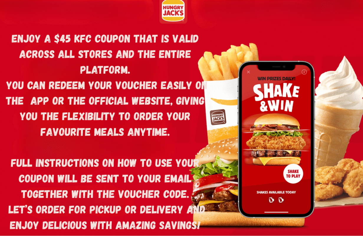 Get a $45 Hungry Jack’s coupon for just $1.85 and enjoy huge savings on your favourite meals. This coupon is valid across all stores and platforms and can be redeemed easily online. Your redemption code will be sent to your email, along with full instructions on how to use it. Perfect for pickup or delivery orders!