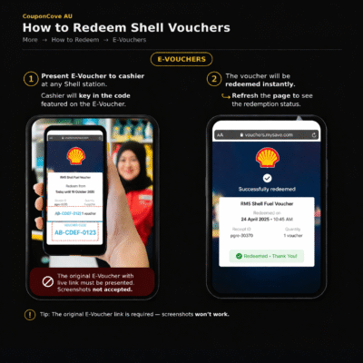 Present E-Voucher to cashier at any Shell station. Cashier will key in code featured on E-Voucher. The original E-Voucher with the live link must be presented, any screenshot of the E-Voucher will not be accepted.